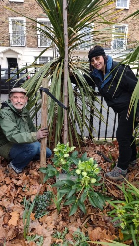 We spent a beautiful, crisp January morning in Canonbury Square’s West garden mostly sweeping up twigs and sticks that had fallen during storm Brendan. Many thanks to the thirteen volunteers who turned out including first-timers Ria and Tomek. We discovered a number of small signs of spring such as the snowdrops and hellebores pushing through the soil in the perimeter beds. We cut back some of the deadwood from the winter, generating six bags of garden waste for the council to collect. Hots cups of tea and coffee and Gill’s home–made panettone kept us going.